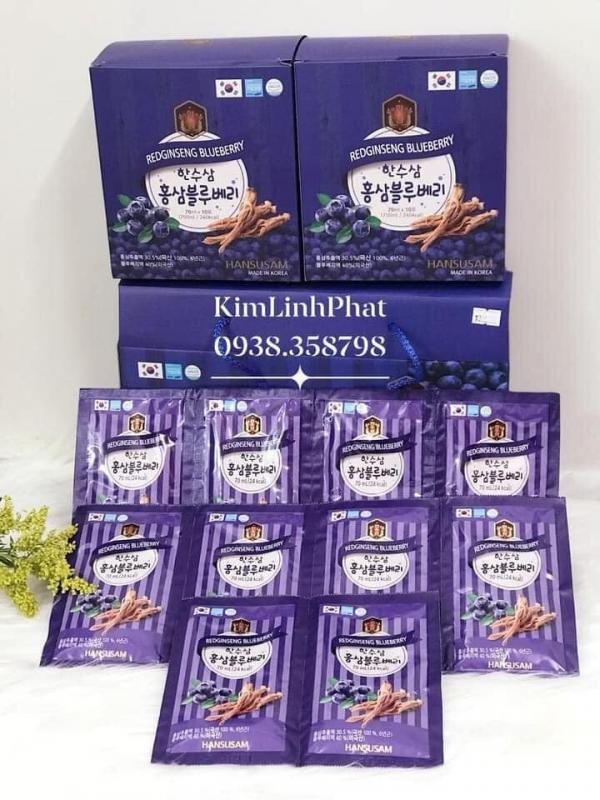 "Nước chiết xuất Việt Quất & Hồng Sâm Hansusam" là sản phẩm được chiết xuất từ nguyên liệu tự nhiên như hồng sâm, việt quất, mật ong và nước tinh khiết, giúp tăng cường sức khỏe và chăm sóc làn da.